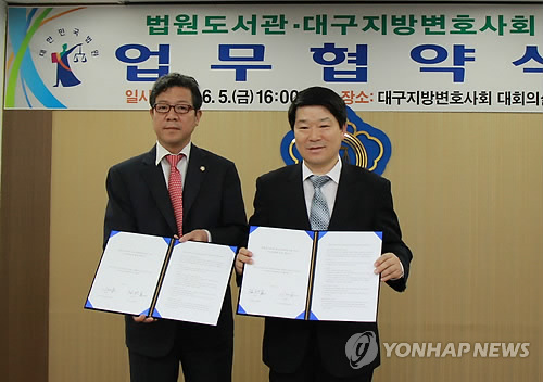 (서울=연합뉴스) 이신영 기자 = 법원도서관은 5일 대구지방변호사회와 법률정보 교환 협약을 체결했다고 밝혔다.