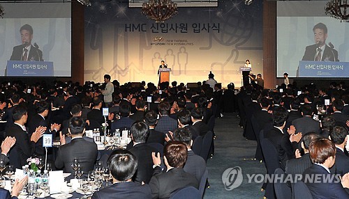 | △ 현대차 사내하청 근로자 400명의 정규직 입사식 (울산=연합뉴스) 현대자동차 울산공장이 5일 경주시 현대호텔 컨벤션 홀에서 사내협력업체 근로자에서 선발된 기술직 신입사원들의 입사식을 열고 있다. 이날 사내하청 근로자 400여명이 정규직 신입사원으로 첫발을 내디뎠다. (현대자동차 제공) |