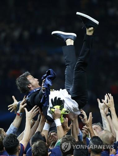 | △ 루이스 엔리케 감독이 우승 후 바르셀로나 선수들로부터 헹가래를 받는 모습.(AP=연합뉴스) |
