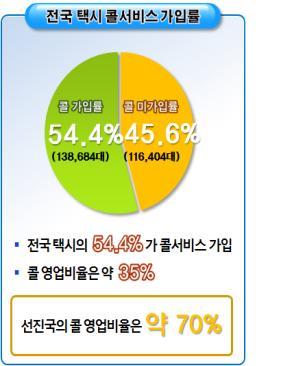 2013년 12월 기준 전국적으로 585개의 콜센터가 1천200여개의 전화번호로 영업하고, 콜서비스를 제공하는 택시는 전체 택시의 54.4%인 13만8천684대이다.