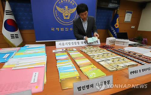 | △ 서울 중구 남대문경찰서에서 서울지방경찰청 국제범죄수사대 수사관이 압수된 대포통장 등을 공개하는 모습.(연합뉴스 자료사진) |