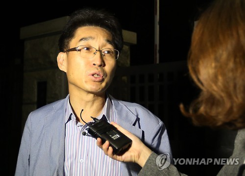 | △ 김근식 구속영장 기각 (의왕=연합뉴스) 한종찬 기자 = 성완종 전 경남기업 회장에게서 2억원을 수수한 혐의를 받는 김근식(54) 전 새누리당 수석부대변인의 구속영장이 기각된 8일 오전 김 전 수석부대변인이 서울 구치소 밖으로 나서며 취재진 질문에 답하고 있다. saba@yna.co.kr |