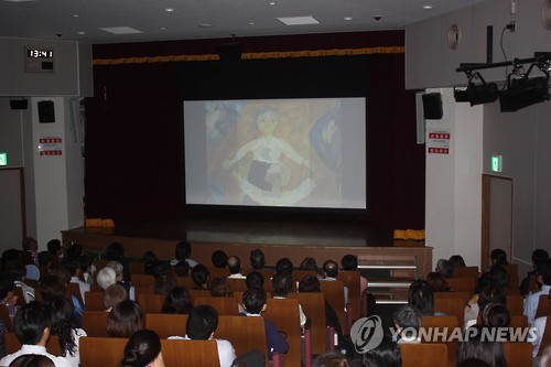 | △ 日언론인이 찍은 군위안부 다큐 영화 도쿄서 공개 (도쿄=연합뉴스) 조준형 특파원 = 7일 도쿄 지요다(千代田)구의 히비야 컨벤션홀에서 200여 관객이 객석을 꽉 채운 가운데 프리랜서 언론인 도이 도시쿠니(62·土井敏邦) 씨가 만든 군위안부 다큐멘터리 영화 '기억과 함께 산다'가 처음 상영됐다. 2015.6.7 jhcho@yna.co.kr |