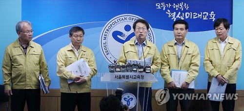 | △ '강남교육청 산하 유치원 초등학교 휴업 지시' (서울=연합뉴스) 한종찬 기자 = 조희연 서울시교육감이 7일 오후 서울 종로구 서울시교육청에서 중동호흡기증후군(메르스) 대응을 위한 서울교육청 대책회의 결과를 발표하고 있다. 이날 서울교육청은 교육감 명으로 8일부터 10일까지 강남교육청 산하 유치원과 초등학교 전체에 휴업을 지시한다고 밝혔다. 2015.6.7 saba@yna.co.kr |