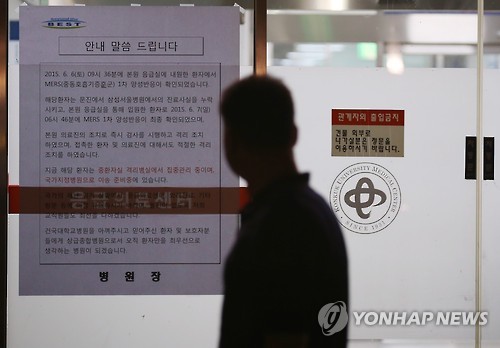 | △ 건국대 병원에서도 메르스 환자 발생 (서울=연합뉴스) 김도훈 기자 = 7일 오후 서울 광진구 건국대병원 응급의료센터에 중동호흡기증후군(메르스) 환자 관련 안내문이 붙어 있다. 건국대 병원은 삼성서울병원을 거쳐온 응급실 환자 A(75·여)씨가 메르스 검사에서 1차 양성 결과를 받아 전날 저녁 응급실을 폐쇄 했지만, 7일 오전 정부가 발표한 메르스 관련 명단에는 빠져 있었다. 2015.6.7 superdoo82@yna.co.kr |