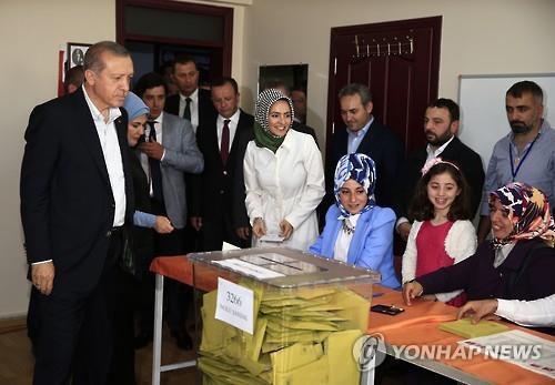 | △ (AP=연합뉴스) 레제프 타이이프 에르도안 터키 대통령이 7일 총선 투표를 하고 있다. |