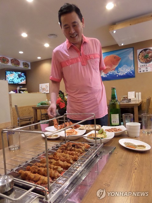 | △ "양꼬치 맛보세요!" (서울=연합뉴스) 고현실 기자 = 서울 영등포구 대림동에서 '아리랑 양꼬치'를 운영하는 김장호 씨가 손님들을 위해 양꼬치를 굽고 있다. 중국 연변에서 온 김 씨는 역시 중국동포인 아내와 함께 2년 전부터 대림동에서 '아리랑 양꼬치'를 운영하고 있다. 2015.6.8 okko@yna.co.kr |