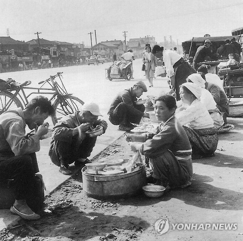 | △ <광복70년> 통계로 본 '천지개벽'의 역사 (서울=연합뉴스) 우리나라는 국제사회로부터 구원의 손길을 애타게 기다리던 최빈국이 한 해 2조3천700억원을 원조하는 국가로 탈바꿈했다. 1인당 국민소득(GNI)이 3만 달러를 바라볼 정도로 눈부신 경제성장을 이룬 덕에 주거, 교통, 환경을 비롯한 생활기반은 물론 교육과 문화생활 수준이 해방 전후와는 비교할 수 없을 정도로 향상됐다. 가난에 허덕이던 세계 최빈국은 이제 세계 10위권에 근접한 경제대국으로 성장했다. 사진은 지난 1961년 길거리에서 끼니를 해결하는 빈민들의 모습. 2015.6.8 << 연합뉴스 DB>> photo@yna.co.kr |