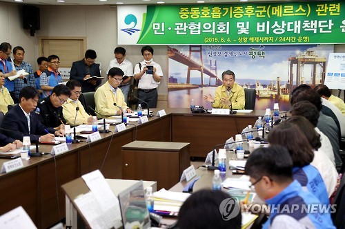 | △ 정종섭 장관, 메르스 개선방안 논의 (서울=연합뉴스) 정종섭 행정자치부 장관이 8일 오전 메르스 방역 및 접촉자 관리실태를 점검하기 위해 경기도 평택시청 민·관 대책상황실을 방문, 메르스 관련 대응 실태의 총력 태세를 당부하는 등 대응시스템에 대한 문제점 및 개선방안 등에 대해 논의하고 있다. 2015.6.8 << 행정자치부 제공 >> photo@yna.co.kr |