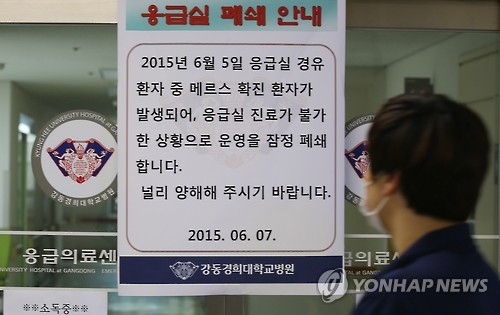 | △ 응급실 폐쇄된 강동경희대병원 (서울=연합뉴스) 김도훈 기자 = 8일 오후 서울 강동경희대병원에서 한 병원 관계자가 폐쇄된 응급실 앞을 지나고 있다. 중앙메르스대책본부는 건국대병원에 입원 중 중동호흡기증후군(메르스) 확진 판정을 받은 76번 환자와 관련, 건국대 병원에 오기 전 거친 강동경희대병원의 239명과 건국대병원의 147명을 각각 이 환자와의 밀접접촉자로 보고 격리 관찰 중이라고 밝혔다. |