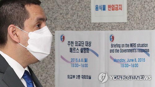 | △ 한국 정부 메르스 대응 설명회 참석 (서울=연합뉴스) 황광모 기자 = 주한 외국대사관의 한 대표가 8일 오후 서울 도렴동 외교부 청사에서 열린 '한국 내 중동호흡기증후군(메르스) 현황과 한국 정부의 대응 조치'에 대한 브리핑에 마스크를 쓰고 입장하고 있다. 이 브리핑에는 78개국의 주한 대사관 대표들이 참석했으며, 정부에서는 외교부, 보건복지부, 민간 감염전문의가 참석해 한국의 메르스 대응 상황에 대해 설명했다. |