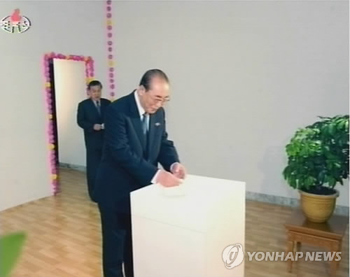 | △ 지난 2011년 7월 24일 북한 지방인민회의 대의원 선거에서 양형섭 최고인민회의 상임위원회 부위원장이 투표하는 모습. 2015.6.9. |