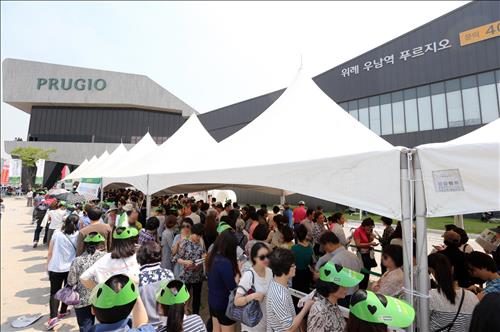 | △ 위례신도시 우남역 푸르지오 아파트가 청약 1순위에서 평균 161대 1의 경쟁률로 마감됐다. 사진은 모델하우스밖에 줄 서있는 방문객들의 모습. |