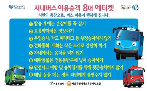 서울시와 버스업계는 9일 버스를 안전하고 기분 좋게 이용할 수 있도록 시내버스 이용승객이 지켜야 할 8가지 승차 예절을 소개했다.