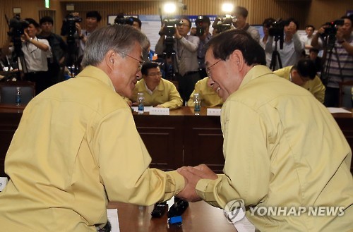 | △ 악수하는 문재인 대표-박원순 시장 (서울=연합뉴스) 홍해인 기자 = 새정치민주연합 문재인 대표(왼쪽)가 9일 오후 서울 태평로 시청에 마련된 서울시 중동호흡기증후군(메르스) 방역대책본부 상황실을 방문해 중동호흡기증후군(메르스) 대응 상황에 대한 설명을 들은 뒤 박원순 서울시장과 악수하고 있다. |