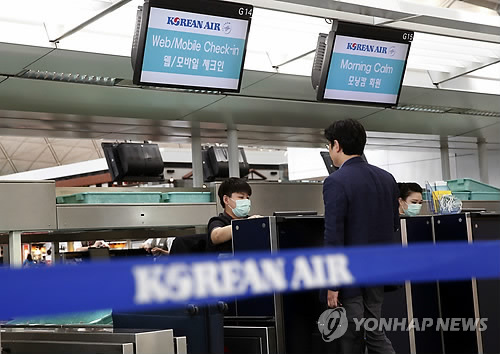 | △ 中·홍콩내 격리 한국인 10명 격리 '해제' (홍콩 AP=연합뉴스) 중동호흡기증후군(메르스)으로 한국에 대해 9일(현지시간) 여행경보를 발령한 홍콩의 국제공항 대한항공 카운터에서 이날 한 승객이 탑승 수속을 밟고 있다. 중국 출장 중 중동호흡기증후군(메르스) 확진 판정을 받은 한국인 K씨와 밀접 접촉했을 것으로 의심돼 중국과 홍콩에서 격리된 한국인 10명은 이날 격리 해제된 것으로 전해졌다. |