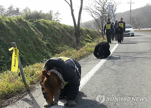 이씨 등 참석자들은 이날 오전 9시 강남구 세곡동 휘여울소교를 출발해 서초구 염곡동 코트라 앞까지 약 5㎞를 삼보일배로 이동했다.