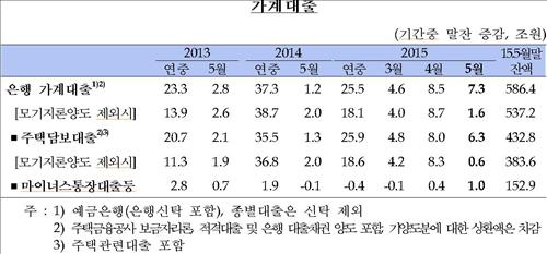 한국은행이 10일 발표한 '5월 중 금융시장 동향'에 따르면 지난달 말 현재 은행권의 가계대출(모기지론 양도 포함) 잔액은 586조4천억원으로 한 달 전보다 7조3천억원 늘었다.