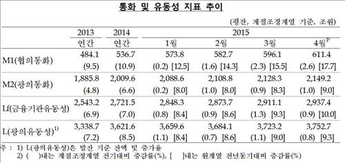 한국은행이 10일 발표한 '4월 중 통화 및 유동성 동향'에 따르면 4월 시중통화량(M2·광의통화)은 2천148조1천억원(평잔·원계열 기준)으로 작년 같은 달보다 9.0% 증가했다.