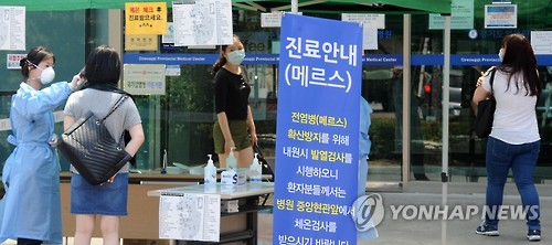 | △ 메르스 중점 치료센터 경기도의료원 수원병원 (수원=연합뉴스) 신영근 기자 = 10일 오후 메르스 환자와 모니터링 대상자를 전담 치료하는 '경기도 메르스 중점 치료센터' 경기도 수원시 장안구 경기도의료원 수원병원 앞에서 병원 내방객들이 체온을 측정하고 있다. |
