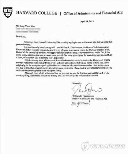 미국 버지니아주 토머스제퍼슨 과학고에 재학 중인 김정윤 양과 그 가족은 김 양이 여러 명문대로부터 입학 허가를 받았다고 밝혀 최근 국내 언론의 큰 관심을 끌었지만, 하버드대와 스탠퍼드대는 이날 김 양의 합격 사실을 전면 부인했다.