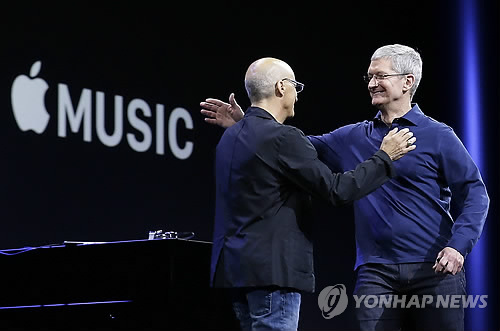| △ 애플 뮤직은 애플이 작년에 인수한 '비츠 뮤직'과 기존의 '아이튠스 라디오' 서비스를 결합한 것으로 24시간 중단 없이 돌아가는 플레이리스트 방식 글로벌 라디오 '비츠 원'과 함께 운영될 예정이다. 사진은 지난 8일(현지시간) 미국 샌프란시스코에서 열린 연례 세계개발자회의(WWDC)에서 팀 쿡 애플 최고경영자(오른쪽)와 지미 아이오빈 비츠 공동창업자가 포옹하는 모습. (AP=연합뉴스) |