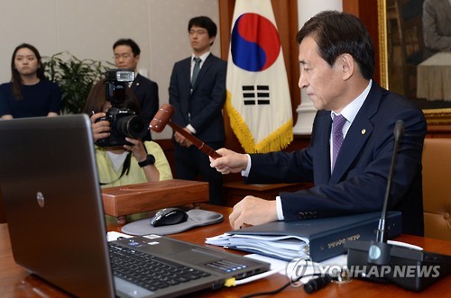 | △ 의사봉 두드리는 이주열 한국은행 총재 (서울=연합뉴스) 박지호 기자 = 이주열 한국은행 총재가 11일 오전 서울 소공동 한국은행본점에서 열린 금융통화위원회 회의에서 의사봉을 두드리고 있다. |