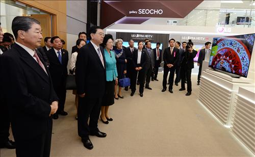 <사진 : 구본준 LG전자 부회장과 장더장(張德江) 중국 전국인민대표대회 상무위원장(왼쪽부터)이 12일 오전 서초구 양재동에 위치한 LG전자 서초R&D캠퍼스에서 쇼룸을 둘러보고 있다.>