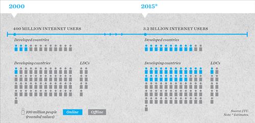 2000년과 비교해보면 선진국은 대략 7억명, 개도국은 20억명, 최빈국은 1억명 가까이 늘어났을 정도로 인터넷 인구는 폭발적으로 증가했다.