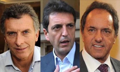 | △ 아르헨티나 대선 후보 3인방. 왼쪽부터 마우리시오 마크리 부에노스아이레스 시장, 세르히오 마사 연방하원의원, 다니엘 시올리 주에노스아이레스 주지사. |