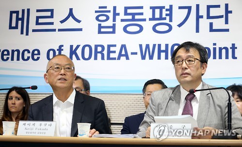 | △ 메르스 합동평가단 공동 기자회견 (세종=연합뉴스) 배재만 기자 = 한국과 세계보건기구(WHO) 합동평가단 공동단장인 케이지 후쿠다 WHO 사무차장(왼쪽)이 13일 오전 정부세종청사 보건복지부에서 열린 기자회견에서 평가단 활동 결과를 발표하고 있다. 오른쪽은 공동단장인 이종구 서울대 의과대학 이종욱글로벌의학센터 센터장. |