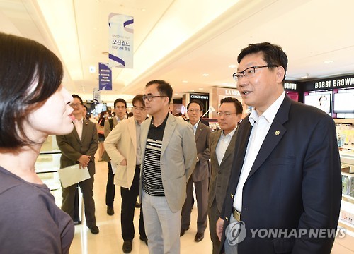 | △ 주형환 차관, 메르스 대응 관련 시내 면세점 현장방문 (서울=연합뉴스) 주형환 기획재정부 차관이 13일 오후 서울 중구 신라면세점을 방문해 매장을 돌아보며 메르스 사태 이후 관광.유통업계 동향을 파악하고 있다. |