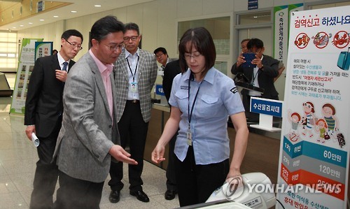 | △ 경의선 남북 출입사무소 방문한 홍용표 장관 (서울=연합뉴스) 홍용표 통일부 장관이 13일 중동호흡기증후군(메르스) 방역 현장 점검을 위해 경기도 파주시 경의선 남북 출입사무소(CIQ)를 방문, 예방 시설 등을 살펴보고 있다. 2015.6.13 << 통일부 제공 >> photo@yna.co.kr |