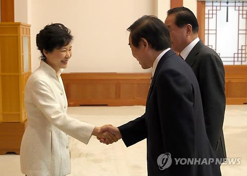 | △ 박근혜 대통령과 누카가 후쿠시로 일한의원연맹 회장이 2014년 10월 24일 청와대에서 악수하고 있다.(연합뉴스 자료사진) |