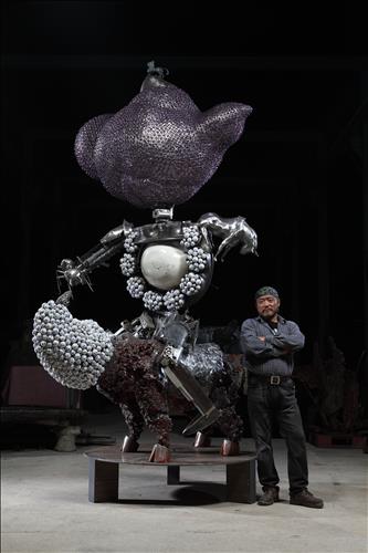 지난 25년간 공업용 특수시멘트와 금속의 고유한 성질을 이용한 작가는 이번에는 용광로의 철 잔해물과 작은 모양의 여러 청화백자 등 다양한 재료를 결합했다.