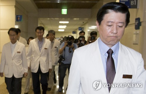| △ 기자회견장 나서는 송재훈 삼성서울병원 병원장 (서울=연합뉴스) 윤동진 기자 = 송재훈 삼성서울병원 병원장이 14일 오전 서울 강남구 서울삼성병원 암병원에서 열린 중동호흡기증후군(메르스)과 관련된 병원 방침을 밝힌 후 기자회견장을 나서고 있다. |