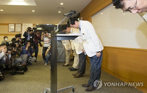 | △ '국민 여러분께 사죄드립니다' (서울=연합뉴스) 윤동진 기자 = 14일 오전 서울 강남구 서울삼성병원 암병원에서 열린 기자회견에서 송재훈 삼성서울병원 병원장(오른쪽 두 번째)등 병원 관계자들이 인사를 하고 있다. 송 원장은 이날 기자회견에서 "이날부터 신규 외래·입원 환자를 한시적으로 제한하며 응급수술을 제외하고는 수술과 응급진료도 한시 중단한다"고 밝혔다. 2015.6.14 mon@yna.co.kr |