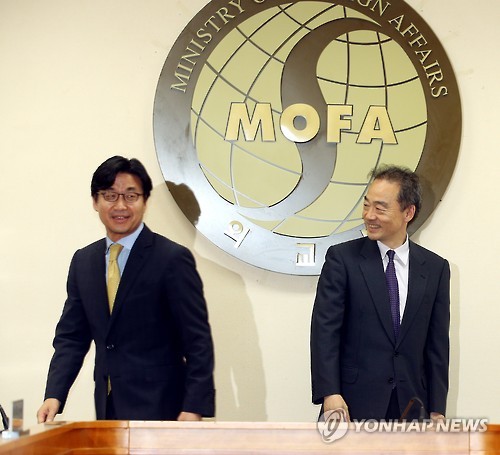 | △ '각자 자리로' (서울=연합뉴스) 서명곤 기자 = 9일 오후 서울 종로구 도렴동 외교부 청사에서 최종문 유네스코 협력대표(왼쪽)가 일제 강점기 조선인 강제노동 시설이 포함된 일본 근대산업시설의 세계유산 등재 추진을 놓고 신미 준(新美潤) 외무성 국제문화교류심의관 겸 스포츠담당대사와 한일 2차 양자 협의에 앞서 악수를 한 뒤 자리로 향하고 있다. 2015.6.9 cherora@yna.co.kr |