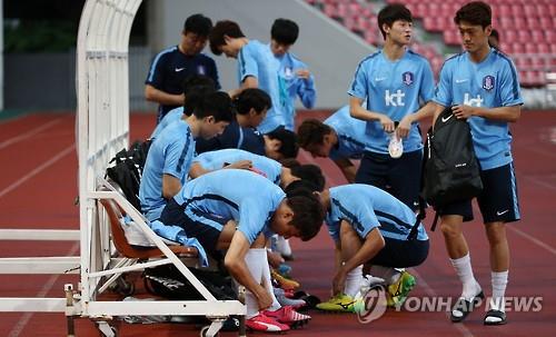 | △ (방콕=연합뉴스) 전수영 기자 = 월드컵 본선 진출을 향한 대장정의 힘찬 첫 걸음을 내디딘 축구 대표팀 이청용(오른쪽), 염기훈 등 선수들이 14일 오후 태국 방콕의 라자망갈라 스타디움에서 열린 첫 훈련을 준비하고 있다. 축구대표팀은 이곳 라자망갈라 스타이움에서 한국시간으로 16일 오후 9시 미얀마와 월드컵 2차예선 G조 첫 경기를 치른다. 2015.6.14 swimer@yna.co.kr |
