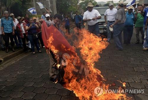 | △ 니카라과 후이갈파 시에서 14일(현지시간) 니카라과운하 건설에 반대하는 농민과 원주민 시위대 1만5천여명이 거리 시위를 벌이던 중 집권 여당의 깃발을 불태우고 있다.(EPA=연합뉴스) |