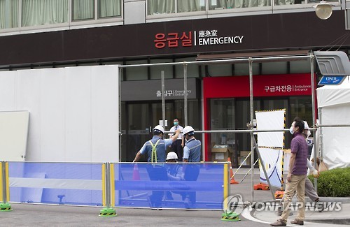 | △ 삼성서울병원, '응급실 출입구 펜스 설치' (서울=연합뉴스) 윤동진 기자 = 14일 오후 서울 강남구 삼성서울병원 응급실 건물 앞에서 병원 관계자들이 펜스를 설치하고 있다. 이날 삼성서울병원에서 열린 기자회견에서 송재훈 병원장은 "이날부터 신규 외래·입원 환자를 한시적으로 제한하며 응급수술을 제외하고는 수술과 응급진료도 한시 중단한다"고 밝혔다. |