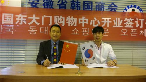 | △ 상징그룹코리아(대표 이재희)는 중국 내 2천500여개 프랜차이즈 지점을 보유한 한류기업 '상징그룹'(한국총괄 부회장 김병현)이 최근 중국 허페이시 중심가에 있는 한류패션 전문쇼핑몰 '코스몰'(회장 공성문)과 동대문 한류패션타운 유치계약을 체결했다고 발표했다. 사진 왼쪽부터 코스몰 공성문 회장, 상징그룹 한국총괄 김병현 부회장. |