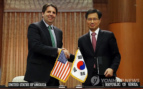 | △ 지난 4월 22일 서울 세종로 외교부 청사에서 박노벽 외교부 원자력 협력대사와 마크 리퍼트 주한 미국대사가 협정에 가서명한 뒤 악수하고 있다. (연합뉴스 자료사진) |