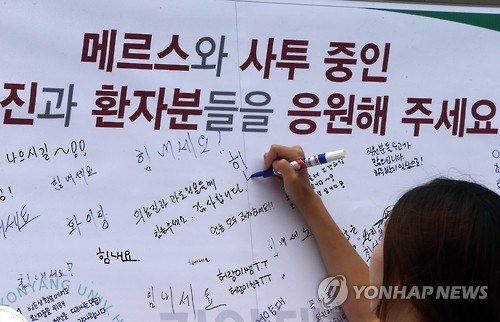 | △ "메르스 의료진 힘내세요" (대전=연합뉴스) 양영석 기자 = 중동호흡기증후군(메르스) 광풍이 전국을 휩쓰는 가운데 11일 대전 건양대학교 의과·보건계열 학생들이 메르스 환자를 치료 중인 의료진에게 보낼 응원의 메시지를 적고 있다. 2015.6.11 youngs@yna.co.kr |