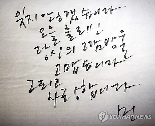안씨는 의료진을 포함해 메르스로 불철주야 고생하는 모든 사람에게 감사의 마음을 담아 이 손글씨를 썼다고 설명했다.