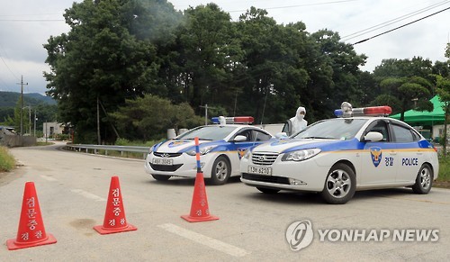 | △ 출입 통제된 메르스 양성반응 환자 발생마을 (순창=연합뉴스) 백도인 기자 = '중동호흡기증후군(메르스)' 양성반응 환자가 발생한 전북 순창군 A 마을의 출입을 5일 경찰과 방역 담당자들이 통제하고 있다. 전북도는 이 마을에 사는 B(72·여)씨가 1차 검진에서 메르스 양성 판정을 받자 확산을 막기 위해 통제에 들어갔다. 국내에서 메르스 확산 방지를 위해 마을이 통째로 출입 통제된 것은 처음으로 알려졌다. 2015.6.5 doin100@yna.co.kr |