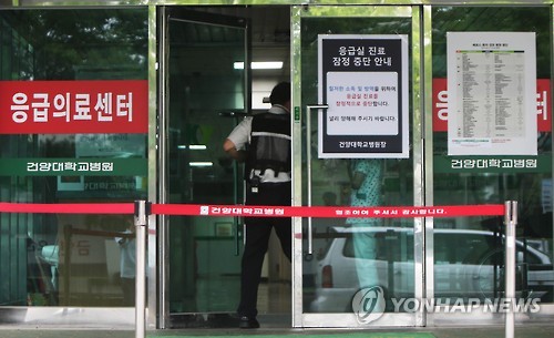 | △ 건양대병원 응급실 진료 잠정 중단 (대전=연합뉴스) 이재림 기자 = 15일 오후 대전 서구 건양대학교병원 응급실 출입문에 '진료 잠정 중단' 안내문이 붙어 있다. 중동호흡기증후군(메르스) 환자 심폐소생술을 하다 메르스 확진 의료인이 발생한 병원 측은 복지부 중앙메르스관리대책본부와 협의해 응급실 진료를 일시 중단하고 중환자실과 외래는 일정 기간 신규 환자를 받지 않기로 했다. |