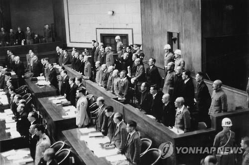 | △ 1946년 5월 3일 일본 도쿄에서 열린 극동군사재판(도쿄재판)의 법정에서 재판장 입정 때 참석자들이 자리에서 일어서 있다.(교도=연합뉴스 자료사진) |