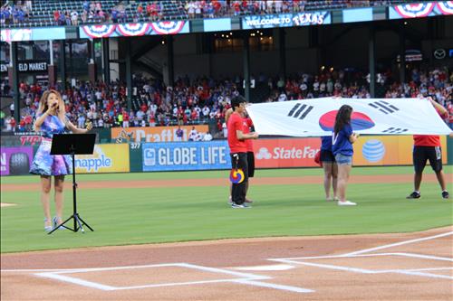텍사스의 연고지에 있는 댈러스 한인회(회장 안영호)의 초청으로 15년 만에 다시 메이저리그 구장을 방문한 양파는 이번에는 우리나라 애국가를 불렀다.