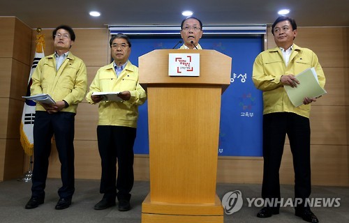 | △ 교육부·시도 교육감 메르스 관련 협의 결과 발표 (서울=연합뉴스) 황광모 기자 = 황우여 사회부총리 겸 교육부 장관(오른쪽에서 두 번째)이 16일 오후' 방역 수업' 재개를 위한 시도교육감과의 협의 결과 발표를 하고 있다. (왼쪽부터) 조희연 서울시 교육감, 이재정 경기도 교육감, 황 부총리, 김병우 충북도 교육감. |